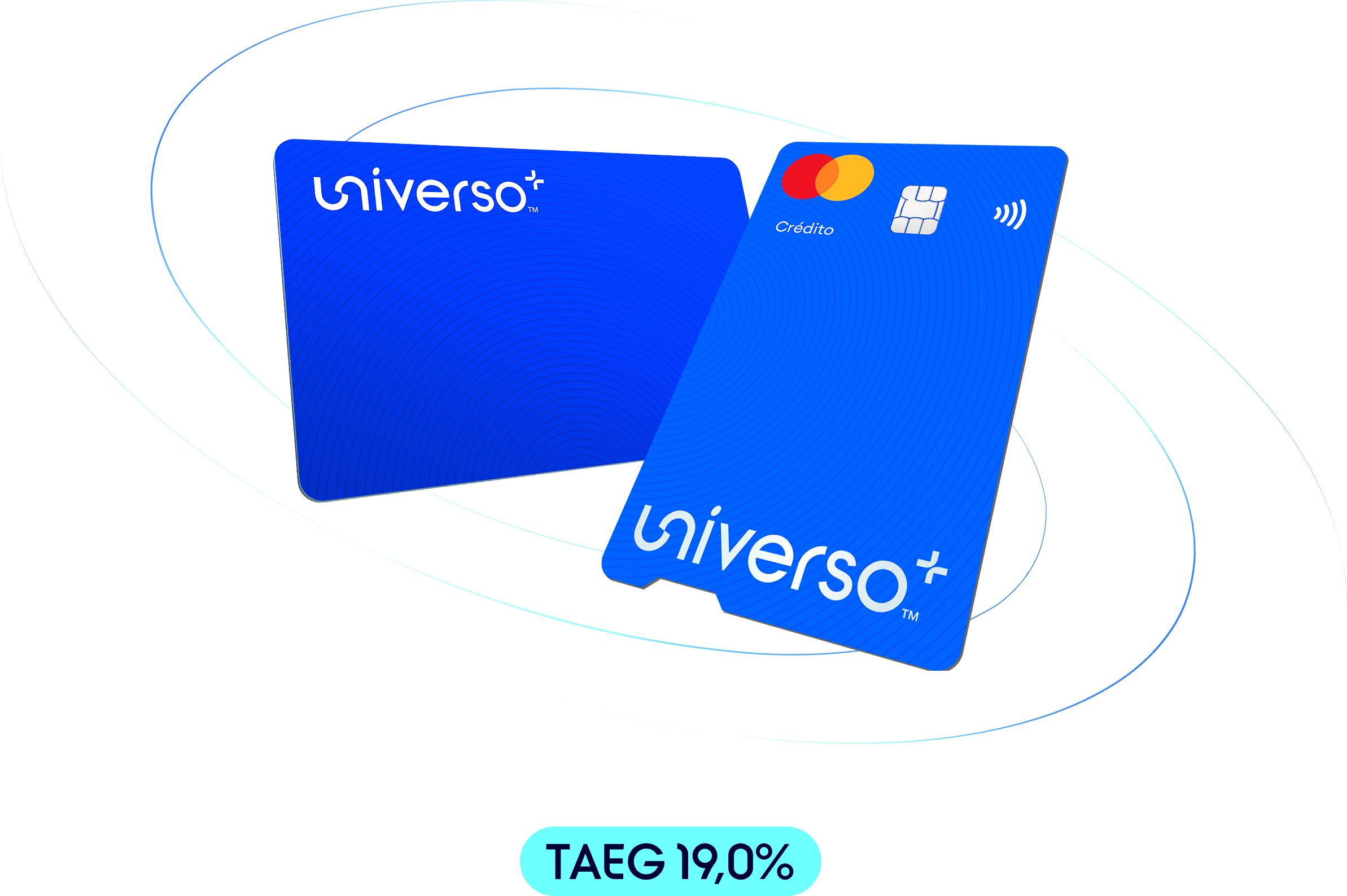 CARTÃO UNIVERSO+: TAEG 19,0%. Exemplo para limite de crédito de 1.500€, reembolsado em 12 meses, TAN 18,50%. Crédito sujeito a aprovação e concedido por Universo, IME, S.A., registada no Banco de Portugal com o número 7500.