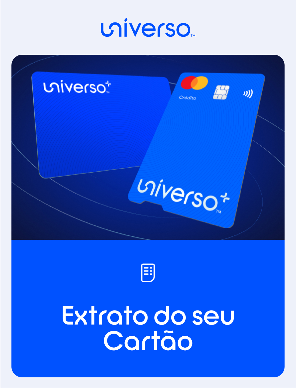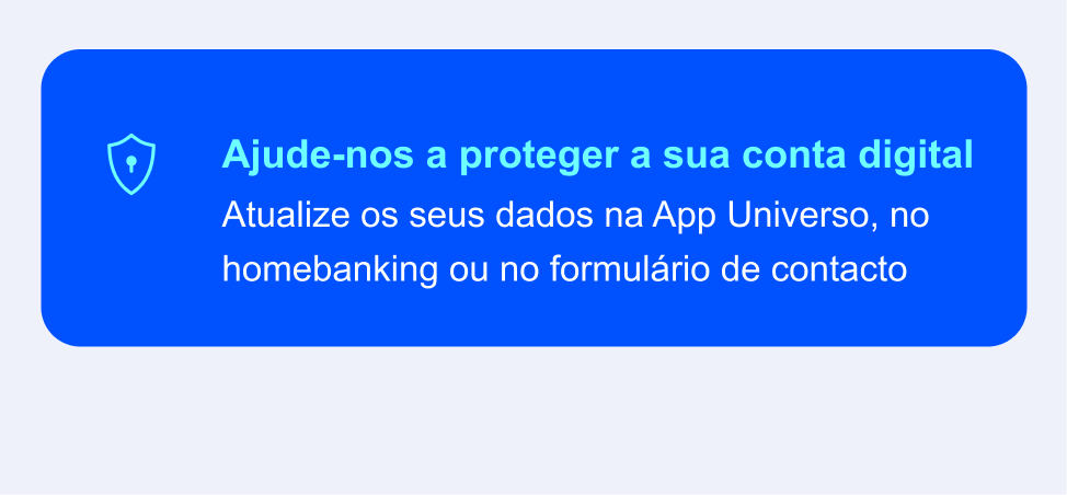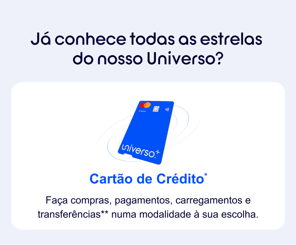 * CARTÃO UNIVERSO+: TAEG 18,9%. Exemplo para limite de crédito de 1.500€, reembolsado em 12 meses, TAN 18,43%. Crédito sujeito a aprovação e concedido por Universo, IME, S.A., registada no Banco de Portugal com o número 7500.